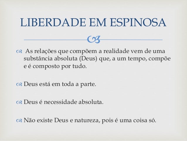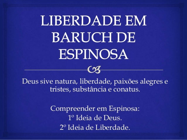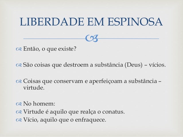195Ulysses Pinheiro 2Servidão e acrasia segundo Espinosa 1A servidão é o tema da parte IV da Ética de Espinosa e marca o início dasreflexões propriamente morais contidas no livro depois de as três primeiraspartes terem tratado da ontologia da natureza da mente humana do conhecimentoe das emoçõesO título da parte IV Da servidão humana ou daforça dos afetos pode. Substância significa em uma compreensão geral e inicial aquilo que está por baixo o que é estável o sustentáculo da realidade a base do que existe. O indivíduo é livre quando age de acordo com sua causalidade interna.